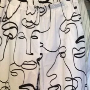 Stylish pants with an abstract face print in black and white. Perfect for a bold fashion statement. 100% Cotton
