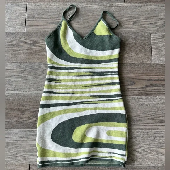 Abstract knit dress, mini, body con, spaghetti strap, green, size small to medium women’s!