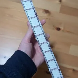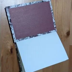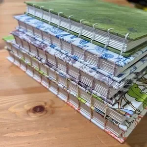 Unique hand bound book with abstract leaf print. This sketchbook is filled with 40 pages of mixed media paper (90 lbs) and finished with homemade tissue paper on the outside and scrapbook paper on the inside. The book measures 14 cm by 19 cm.