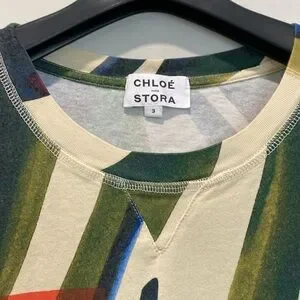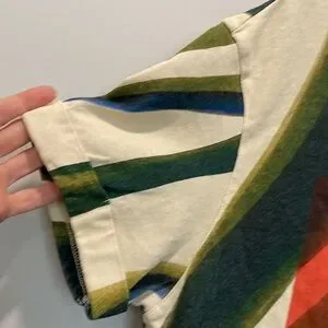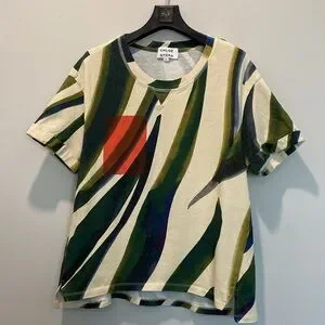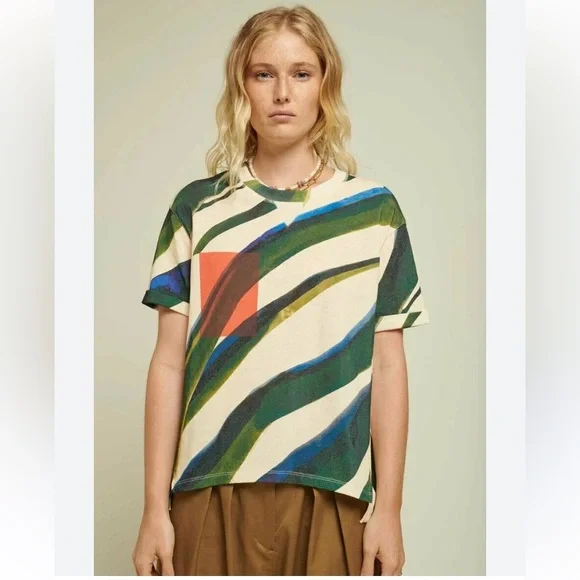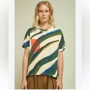 Elevate your style with this abstract multicolor women's top. Featuring a vibrant mix of green, blue, and orange, this top is perfect for any casual outing. Enjoy the comfort and unique design that makes a statement.
