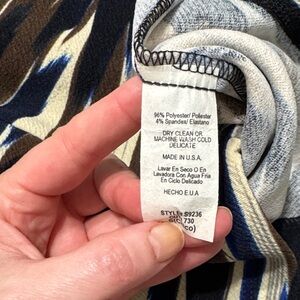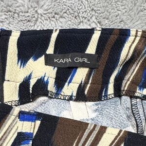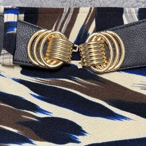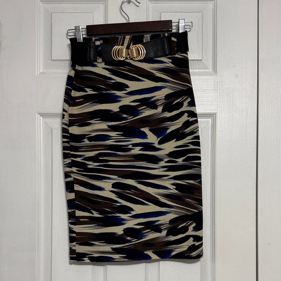 Chic pencil skirt with an abstract brushstroke print in black, brown, cream and blue. Sleek, form-flattering silhouette designed for everyday or office wear. Comfortable stretch fabric for easy movement. Pairs well with blouses and blazers for a polished look. Comes with a removable belt.