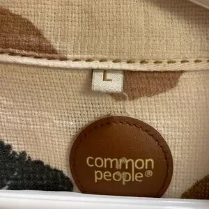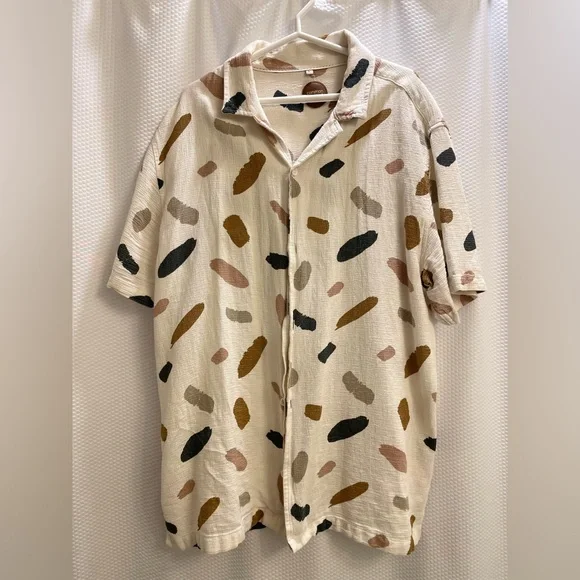 Stylish button-up shirt with an abstract pattern. Features black, brown, and tan brushstroke designs on a cream background.
