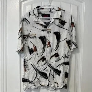 Trendy button-up shirt with an abstract black and brown pattern on a white base. Ideal for casual wear.