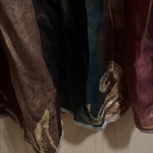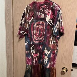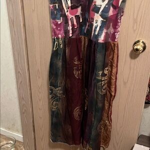 Explore your artistic side with this abstract patterned maxi dress. Featuring a blend of vibrant colors, this dress is perfect for making a statement. Ideal for casual outings or creative events. Hand Painted like Brand New. Pls ask for measurements I think more of a lrg.
