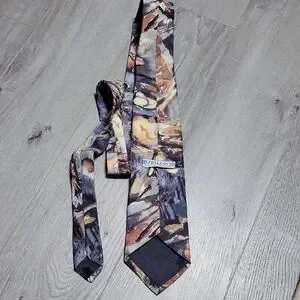 Stylish tie with an abstract pattern.The tie displays an abstract painterly pattern reminiscent of water color paintings.The color palette is predominantly composed of gray,blues and browns.All silk and handmade.In very good condition.Vintage style.