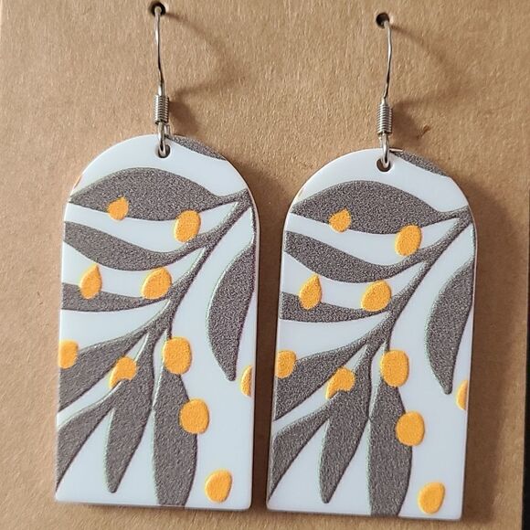 New hand crafted, abstract plant foliage print acrylic dangle earrings on stainless steel hypoallergenic hooks.