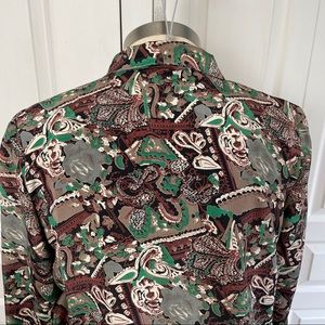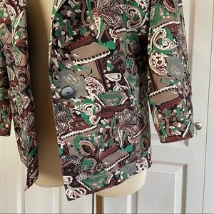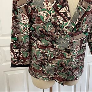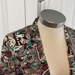 Fully lined, single button blazer has light shoulder padding and front patch pockets. In great vintage shape from JEFF BANkS. Tags have been removed, but is likely poly/rayon blend and best fit size 14. It would look super cute worn oversized as well, so please check msmts for preferred fit.