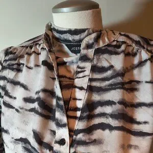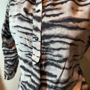 Chic and versatile blouse featuring a modern black-and-taupe abstract stripe print on a silky lightweight fabric. Designed with a flattering tailored fit, 3/4 sleeves, and a partial button-front placket. Perfect to dress up for work or pair with jeans for an elevated casual look.