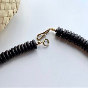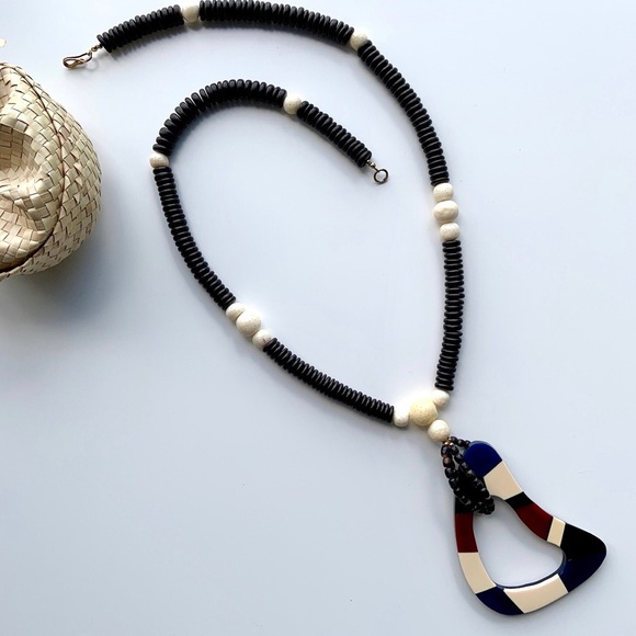 Unique artisan bold statement necklace features black and cream beads with large abstract acrylic pendant.