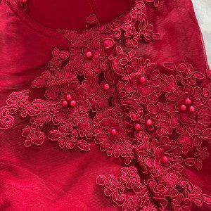Stunning bead embellished red gown by Abyss by Abby. Worn briefly once for photoshoot. Strapless with built-in body suit draped in a sheer, floor length skirt with high side slit.