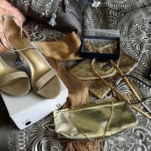 Complete accessories package including size 8 1/2 wide strap. He sandals that are coloured gold sparkly’s gold belt, size XL gold wrap, chunky gold earrings and matching necklace and two gold clutch bags. One is from Aldo.