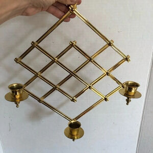 Brass wall mount candle holder. Holds three standard size taper candles. Accordion style makes it so that you can change the shape of it and make it taller and skinnier or shorter and wider.