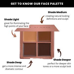 Meet our creamy face palette - the makeup superhero that sculpts and defines your beautiful features. It all started when the four shades - Light, Medium, Dark, and Deeper - got together and realized they were meant for something big. They would go on to form an unstoppable