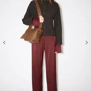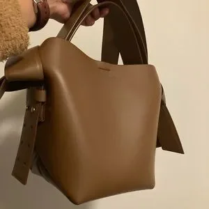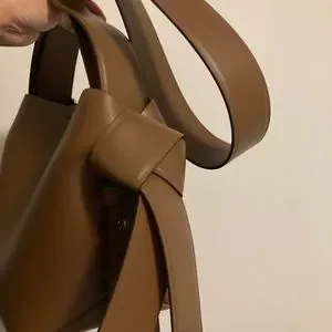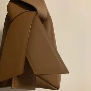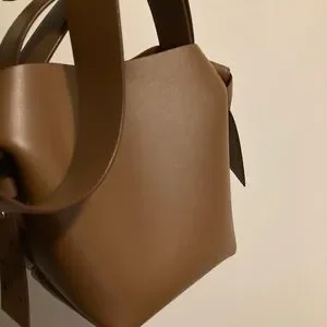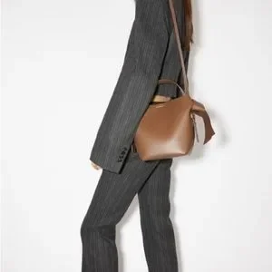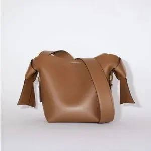 Acne Studios camel brown mini shoulder bag is made of soft leather and is adorned with twisted musubi knots on each side, inspired by traditional Japanese obi sashes. Completed with a middle zippered pocket compartment and a discrete magnetic closure.