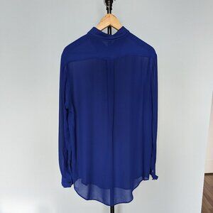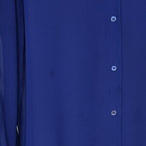 This beautiful blue button up top / blouse from Acne is perfect for spring. Sheer silky feeling (100% polyester) material, oversized fit with tone on tone blue buttons. In very good used condition, there are no rips, runs, or areas of excess wear, but there are two noted small flaws: chipping on one button and small darkened stain on front of the short (both pictured).