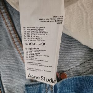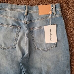 These blue straight leg jeans from Acne feature a light to medium wash with subtle fading for a classic look. The full-length design and regular rise ensure a comfortable fit, perfect for everyday wear. Their timeless style and natural wear patterns add a touch of casual sophistication.