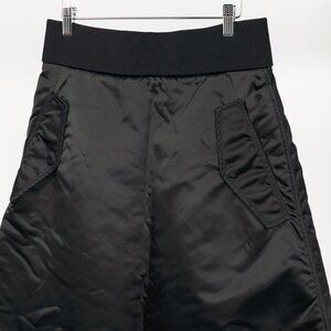 Made in Lithuania, this Pag Bomber skirt from Acne Studios' 2015 Pre-Autumn and Winter collection is crafted in a black nylon, and is padded with a synthetic filling. It features a ribbed banded waistband, front snap-closure flap pockets, a flared A-line silhouette, a midi-length hem, an exposed back zip closure, and is lined in an orange satin.