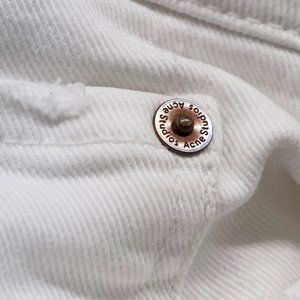 Acne Studios’ rendition of skinny jeans in the style ‘Skin 5 white vintage’ made out of white denim featuring a straight-leg, zipper closure with one button, two front pockets, two back pockets, belt loops, and bronze rivets.