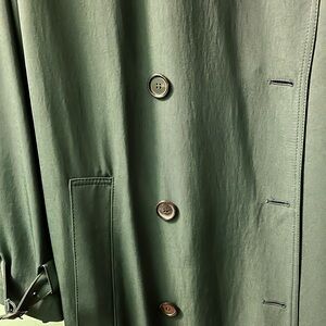 adjustable buckle belt at waist. Easy fit. Wide lapels with hook-and-eye closure and epaulettes. Adjustable buckled sleeve straps. Color: Forest Green.