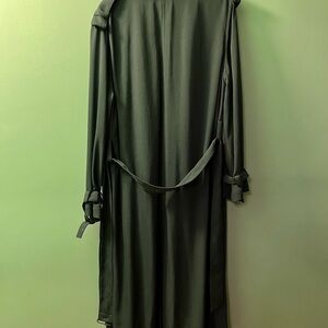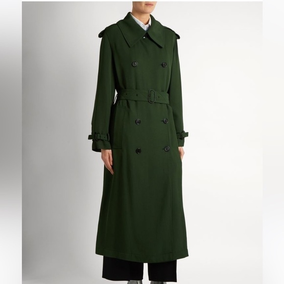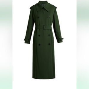 adjustable buckle belt at waist. Easy fit. Wide lapels with hook-and-eye closure and epaulettes. Adjustable buckled sleeve straps. Color: Forest Green.