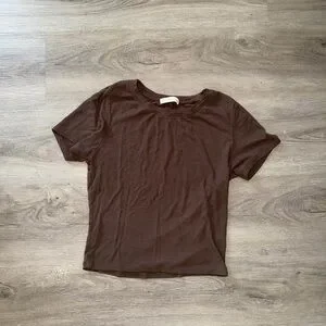 Ribbed short sleeve tee in chocolate brown. Crew neckline and slim fit silhouette. Lightweight, everyday layering piece.