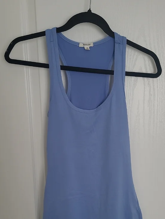 Smooth light blue tank with a scooped neckline. Racerback silhouette for freedom of movement. Soft stretch fabric for everyday comfort. Simple, versatile style for layering or wearing solo.