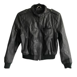 ADA Black Leather Zip Front Long Sleeve Moto Bomber Jacket