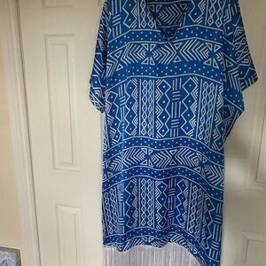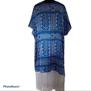 💙🤍stunning easy throw on free size Azam Couture luxury silky blue white urban print fringe hem Bou Bou kaftan v neck dress approx measurements and minimal tassel falling off EUC flaws photographed same day shipping from smoke free home