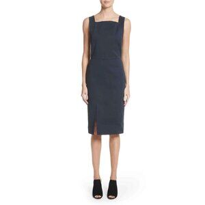 TAGS: Adam Lippes, sheath dress, blue dress, cotton dress, tailored, sleeveless, knee length, lined, elegant, minimalist, office wear, classic style, designer dress, women’s size 0