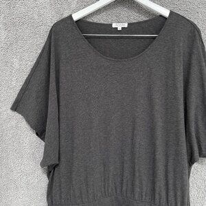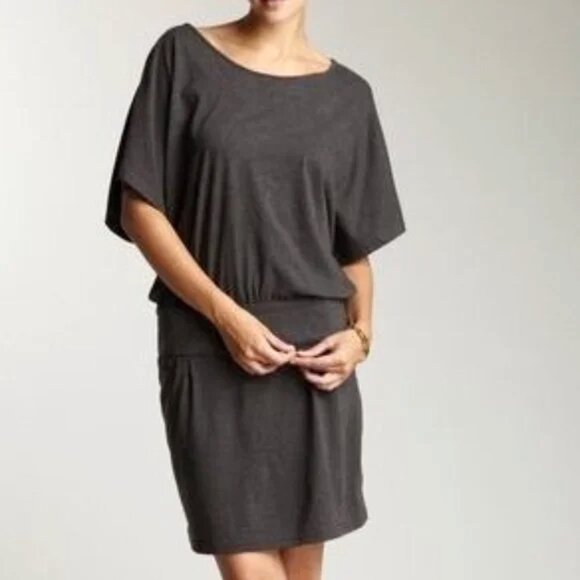 This super soft dress has dolman sleeves, boatneck, and dropped waist. Hidden zipper and button on the side.