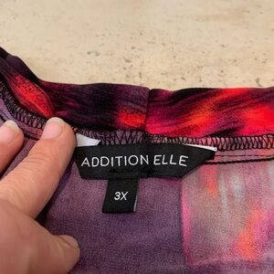 Add a pop of color to your wardrobe with this vibrant Addition Elle long sleeve top in size 3X! Featuring a striking abstract print in shades of purple, fuchsia, red, and black, this blouse is perfect for adding a stylish touch to any outfit. The design appears to have a flattering draped or ruched detail around the waist/front, creating a chic silhouette. Made from a comfortable, likely stretchy fabric, it's ideal for everyday wear or dressing up for a casual occasion.