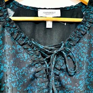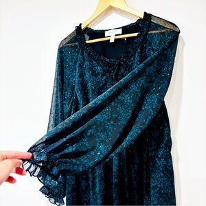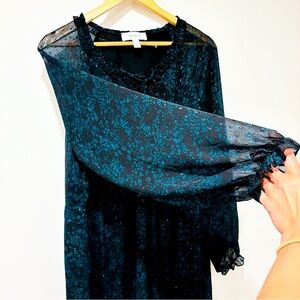 Beautiful black and green floral print dress by Addition Elle featuring sheer long sleeves, lightweight chiffon fabric, and a flattering flowy silhouette. Perfect for work, dinners, or any occasion that calls for chic comfort and effortless style.