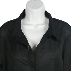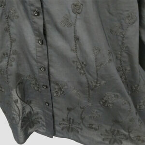 Black, long sleeved blouse with open collar. Embroidered flowers along hem/on sleeves. Button down. Triple button cuffs. 3/4 length sleeves. Sheer fabric.