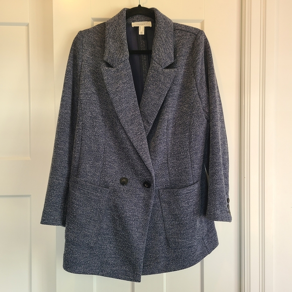 Chic and versatile blazer. Features a textured design that's collegiate looking. Looks great with jeans and a tee. Warm! Packs very well- no wrinkle.