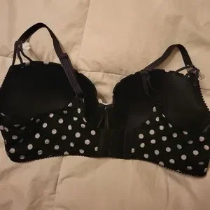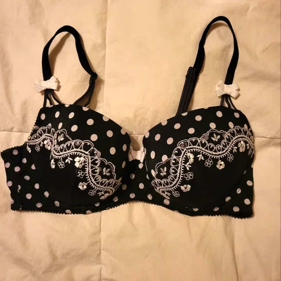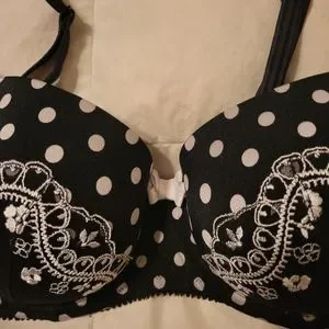 great condition, black and white polka dot with white bows and embroidery accent, size 38D