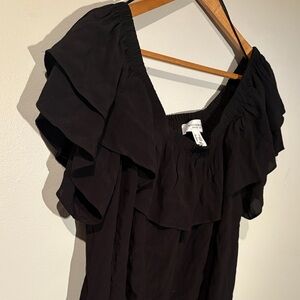 Stylish black top with layered ruffles. Ideal for any occasion.