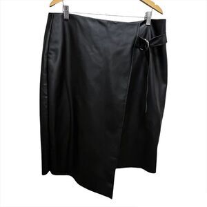 Size 12. Plus size vegan leather skirt, with a pencil silhouette and an asymmetrical front panel. Chic and flattering this skirt looks best with a pair of heels and a tucked in top. Features a decorative front wrap with a side belt and a d-ring metal buckle.