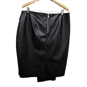 Size 12. Plus size vegan leather skirt, with a pencil silhouette and an asymmetrical front panel. Chic and flattering this skirt looks best with a pair of heels and a tucked in top. Features a decorative front wrap with a side belt and a d-ring metal buckle.