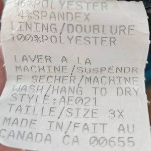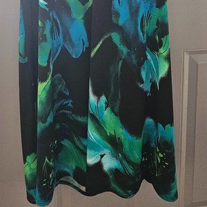 Very pretty multi-coloured Addition Elle dress that frames breasts beautifully. Empire waist style dress that sits approximately 3" below the knee of a woman with 5.5" frame. The material frames a 4X nicely but does fit 3X very well.