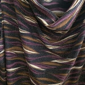 Chic top with multicolor stripes. Features black, brown, and purple tones. Ideal for casual wear.