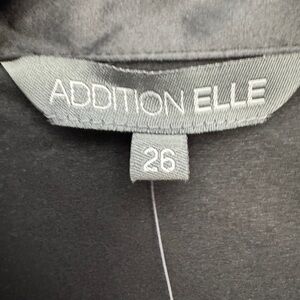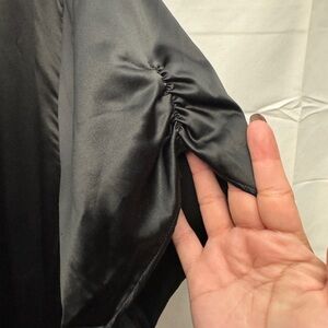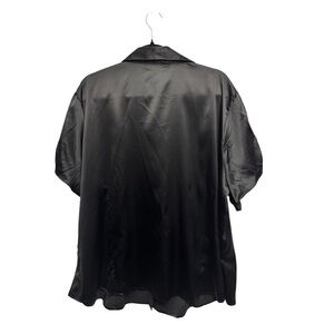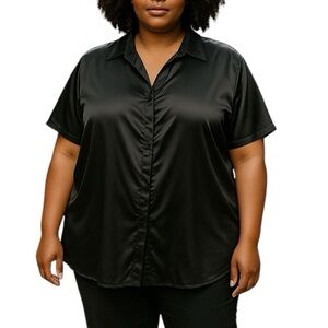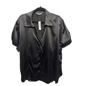 Keywords: Additional Elle Blouse, Black Satin Blouse, Short Sleeve Blouse, Ruched Sleeve Top, Button Closure Blouse, Elegant Satin Top, Women's Fashion Blouse