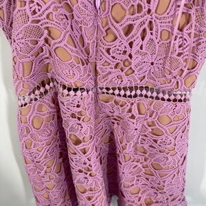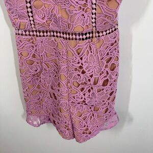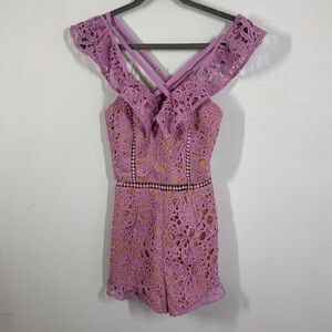 Adelyn Rae Sleeveless Floral Crochet Overlay Nude Lining Lavender Lace Romper XS
