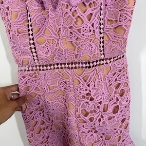 Extra keywords: Adelyn Rae romper, lavender lace romper, floral crochet overlay, nude lining romper, XS party outfit, wedding guest romper, graduation outfit, summer cocktail romper, sleeveless lace playsuit, open back lace romper, chic, casual, stylish, timeless fashion, trend, outings