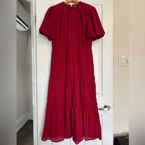 Add a touch of elegance to your wardrobe with this beautiful Adelyn Rae midi dress, perfect for any special occasion. This worn, but well-maintained dress features a flattering silhouette with its cinched waist and tiered skirt. Puff-sleeve design.