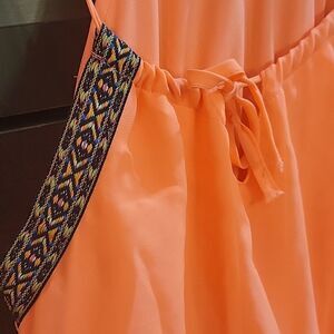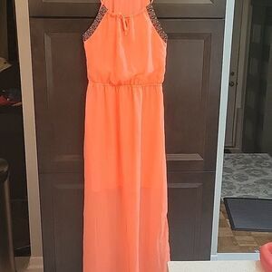 Sleeveless bright coral maxi dress with spaghetti straps and embroidered trim.