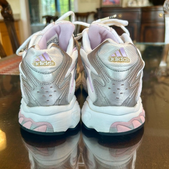These Adidas Adistar Cushion Sporty & Rich Running Shoes are a size 10. They are white, grey and pink.