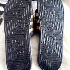 New Adidas Adissage Black & Gold Slides Sandals Slippers Slip-Ons have a flexible nubby foot bed that massages hardworking feet. The bandage upper adjusts for a custom fit. They are designed for rejuvenation & relaxation. Style with jeans, slacks, pants, shorts, cargo pants, overalls, etc. This item is authentic.