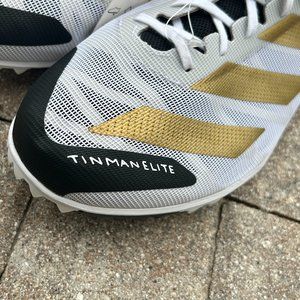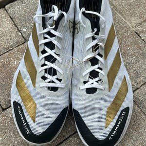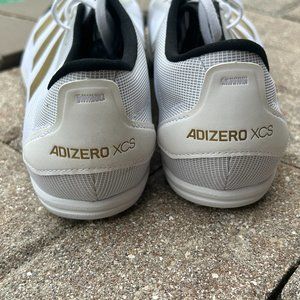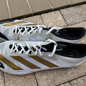 A new pair of Adidas Adizero XCS TME Track Shoes with tags attached but without a box. The color pattern is White/Gold/Black. Model GY4930. These are unisex shoes. Size is Men’s 13 - Women’s 14. Includes a full set of spikes and a wrench. The number "40" is written on each sole.