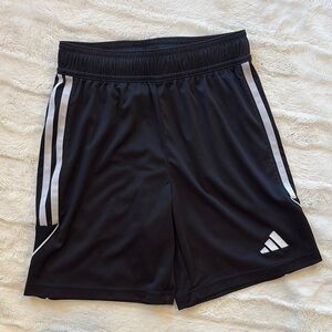 Stylish black athletic shorts with white stripes. Perfect for sports and casual wear.