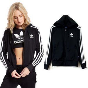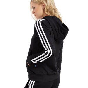 Adidas Black Full Zip Hoodie with White Stripes. Women's size small. 100% poly. Long sleeves. Hooded. Machine washable.